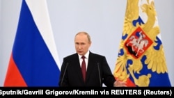 Путин призвал, как он выразился, киевский режим завершить боевые действия и начать переговоры, но при этом подчеркнул, что Россия не будет обсуждать статус четырёх аннексируемых областей.